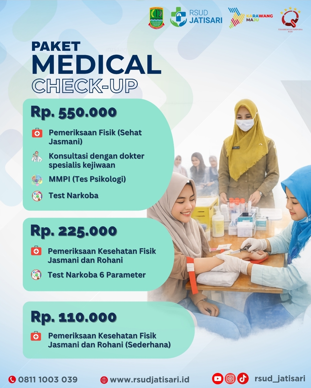 ‎Dalam program tersebut, RSUD Jatisari menawarkan beberapa pilihan paket pemeriksaan kesehatan dengan fasilitas lengkap yang ditangani tenaga medis profesional.